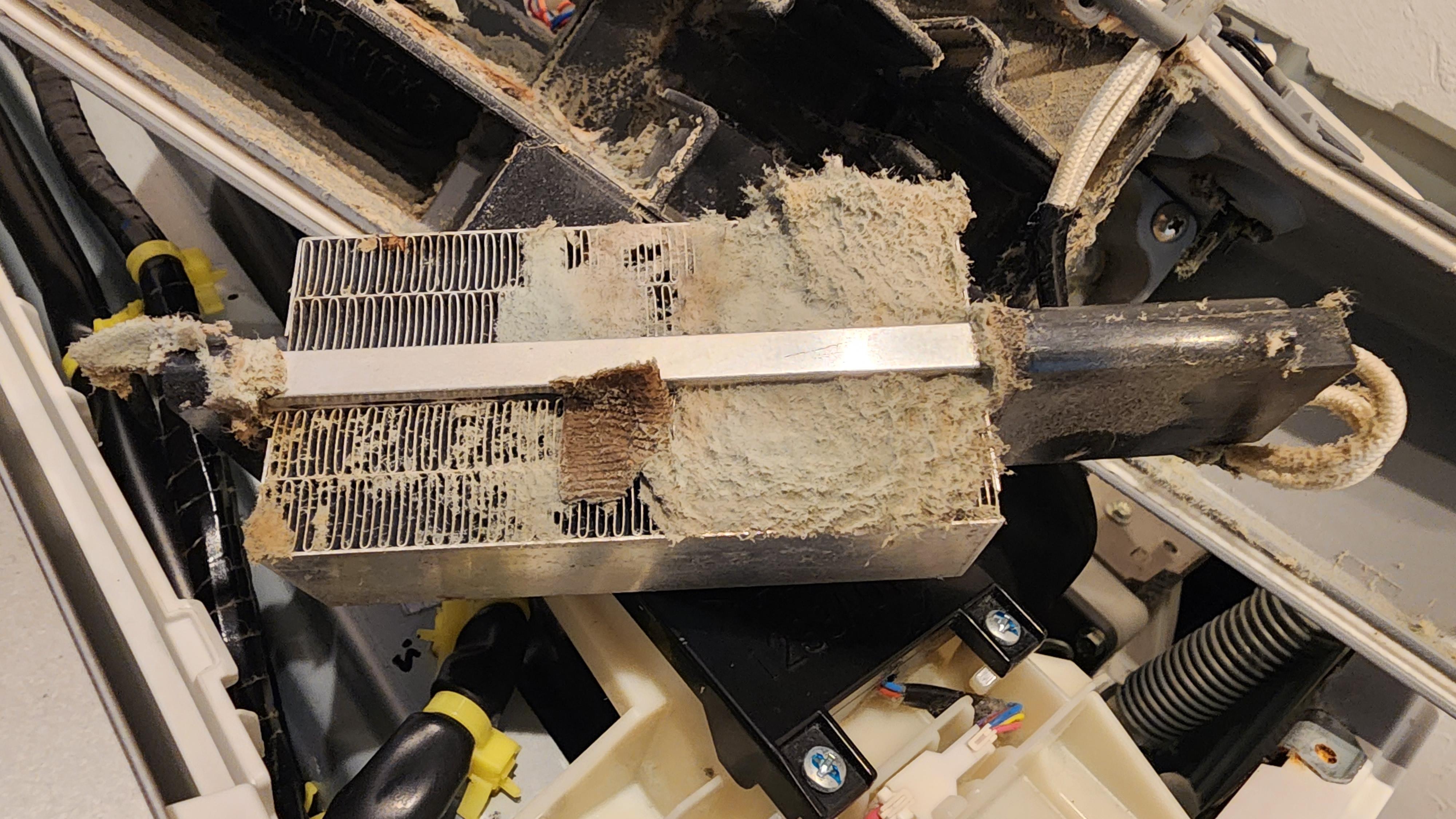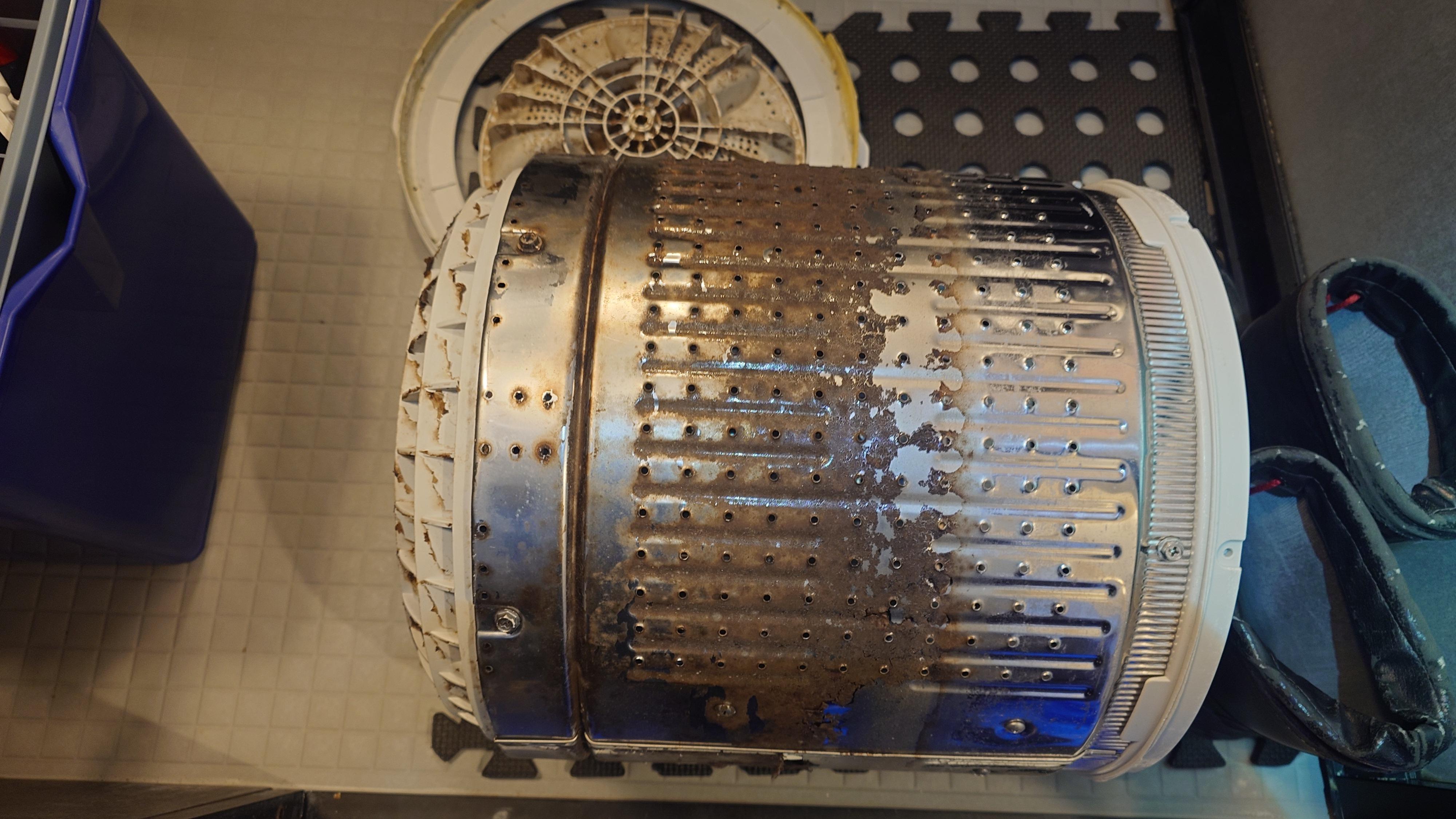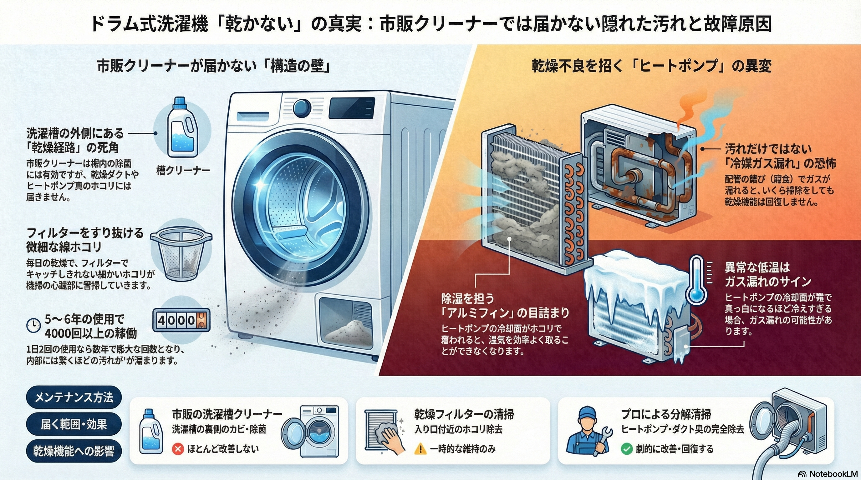 市販の洗濯槽クリーナーが洗浄できるのは、あくまで**「水が直接触れる洗濯槽の裏側」などに限定されます。乾燥機能に関わるヒートポンプや乾燥経路の奥深く**に溜まった汚れを取り除くには、本体を分解して物理的に清掃する以外に方法がないのが現状です。実際に、分解清掃の依頼の約9割が乾燥に関する悩みであり、フィルター掃除などの日常的なお手入れだけでは限界があることが指摘されています。