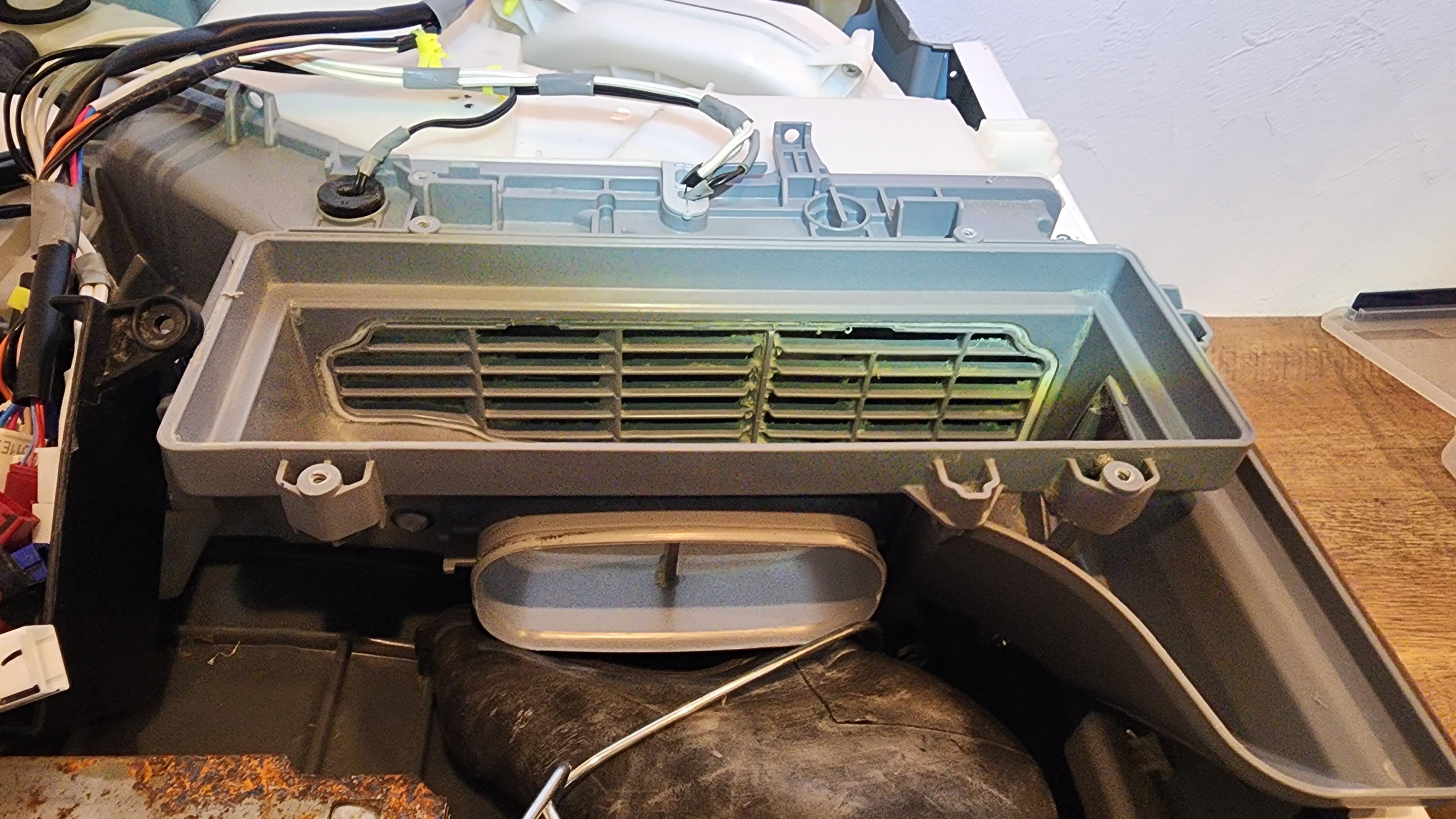 1. ヒートポンプユニット(熱交換器)の配置多くのドラム式洗濯機(パナソニック製など)では、乾燥を行うためのヒートポンプユニットが本体の上部に設置されています。構造上の問題: 洗濯槽クリーナーは「洗濯槽(ドラム)」に水を溜めて洗浄するものですが、ヒートポンプやその内部にある熱交換器は槽よりも高い位置にあるため、洗浄液を含んだ水が物理的に届きません。汚れの蓄積: 乾燥運転中、洗濯物から出た水分を含む風がこのユニットを通りますが、その際に乾燥フィルターを通り抜けた微細なホコリや糸くずが熱交換器のアルミフィン(銀色の部分)に付着します。