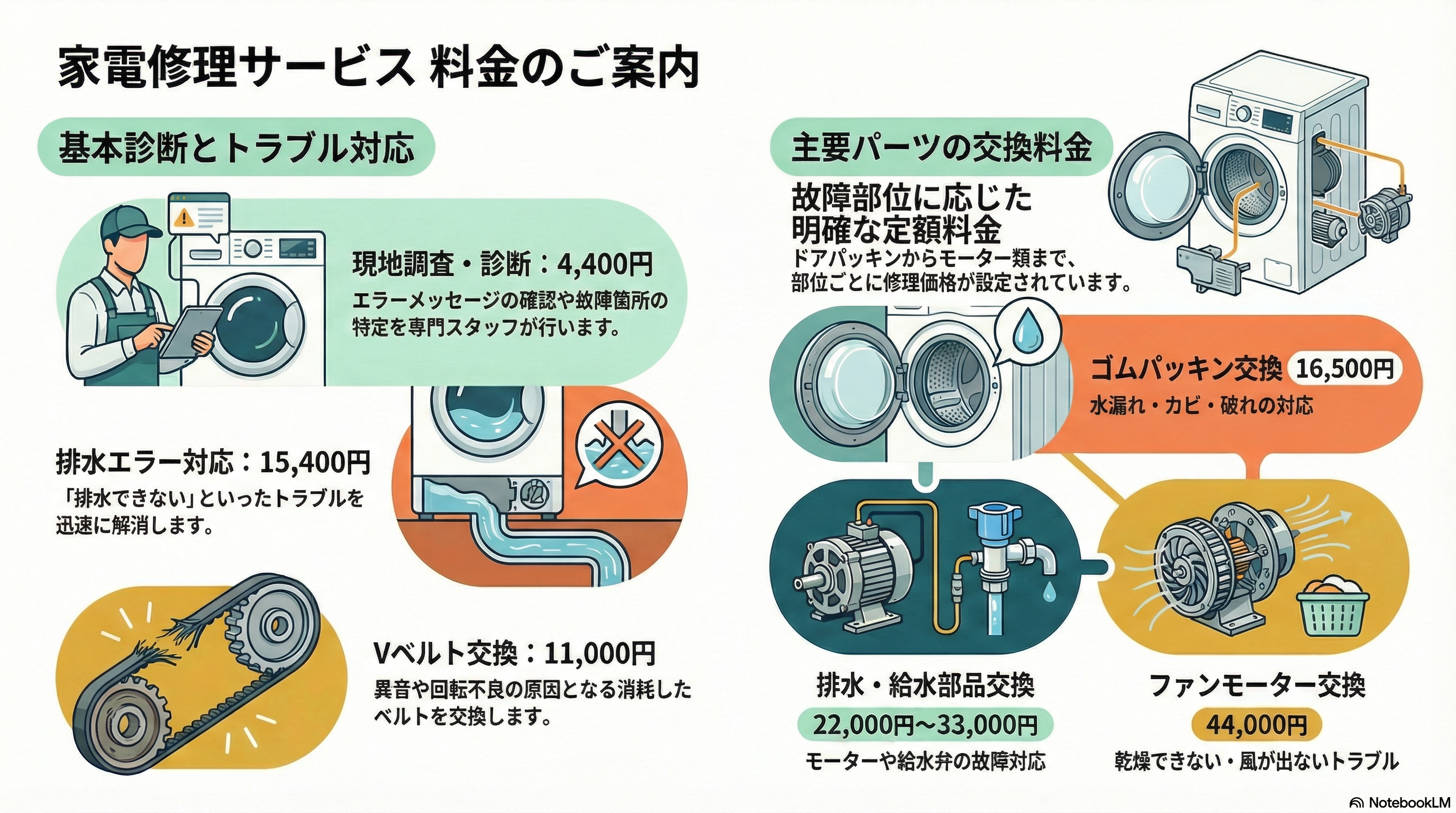 ドラム式洗濯機のクリーニングでは、乾燥機能の低下を招く「ほこり除去」に徹底的にフォーカス。分解清掃を最小限に抑えた独自のノウハウで、従来よりも最短2時間30分の作業時間、低価格での作業を実現。エラー表示の診断・修理にも対応し、家電の不調を総合的に解決します。